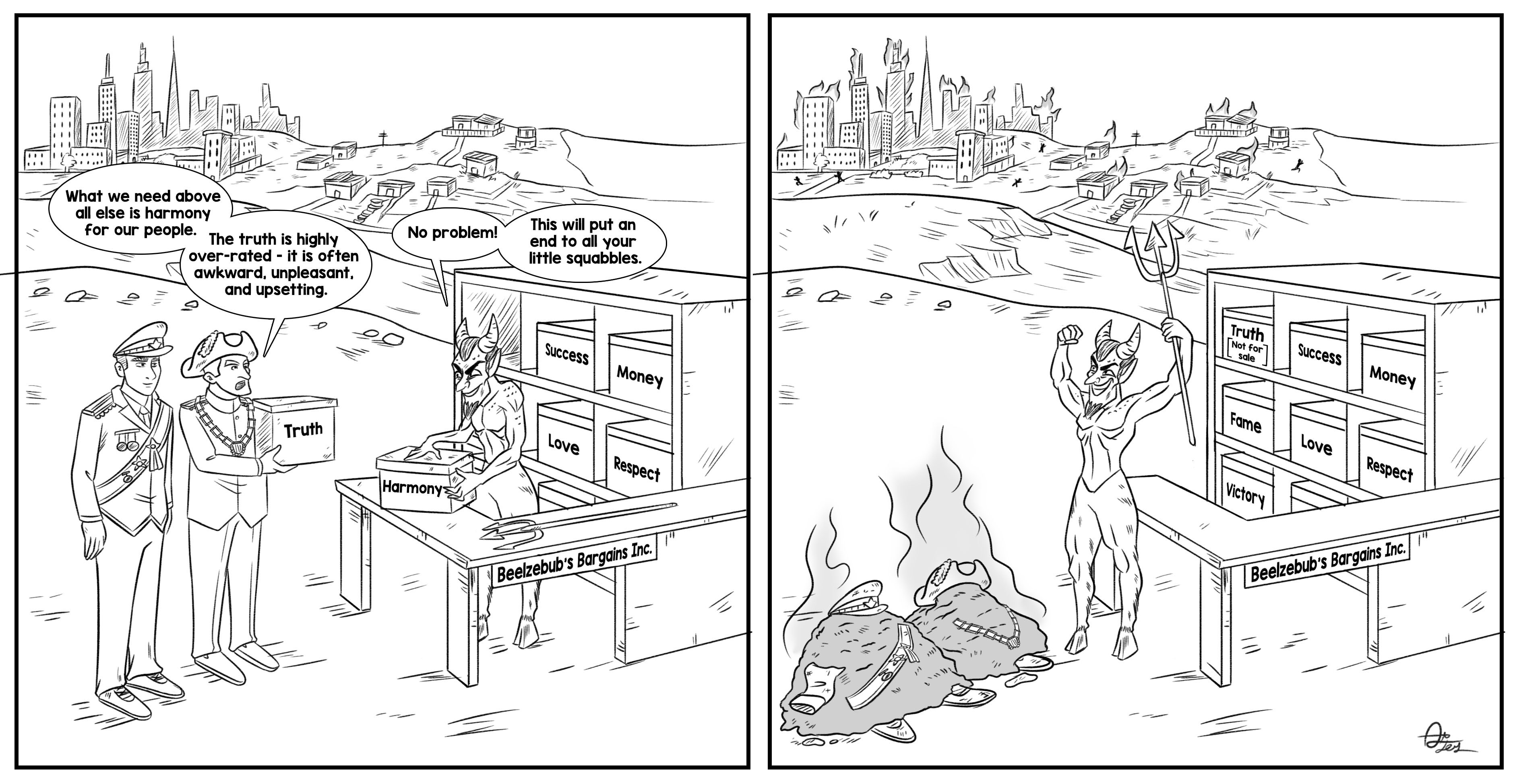![]() Observation #1818: It is currently fashionable to suppress the truth in favour of harmony. But such bargains usually end with the Devil unscathed, and everything else in flames.